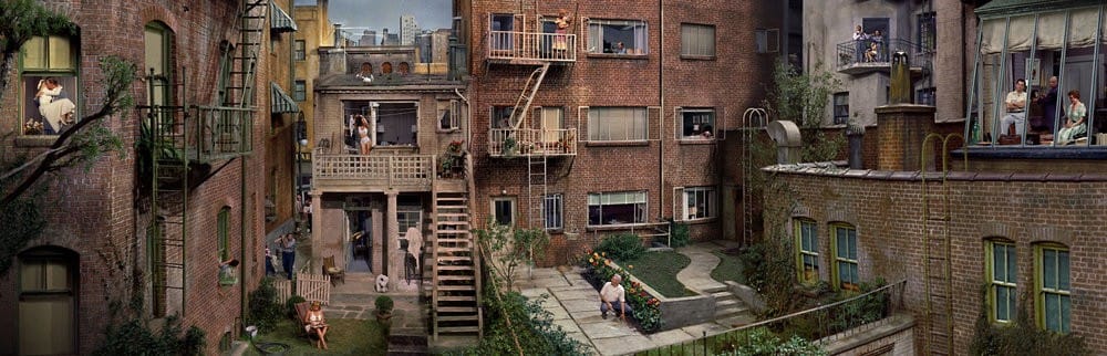 Set in a sweltering New York City summer, L.B. ”Jeff” Jeffries is a restless magazine photographer cooped up in his studio apartment with his leg in a cast. Slouched in PJs and plaster in his wheelchair, through his windows he watches as the everyday dramas of his neighbors across the courtyard play out in their many apartment windows—a single set built by Hitchcock. There’s Miss Lonelyhearts, who throws dinner parties for imaginary gentleman callers. Miss Torso, a young dancer who practices in her underwear and regularly fends off several suitors at a time. There’s the couple who sleep on a mattress on their upper balcony to avoid the heat and lower their beloved little dog in a basket down to the garden to do his business. There’s a pair of newlyweds who only have eyes for each other, and a composer who fears his career is going nowhere. Finally, there is Lars Thorvald, whose wife spends all day in bed while he’s at work, and all night nagging him when he’s home.