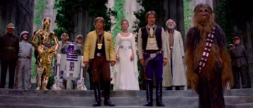 And then, finally, there's Death Star run, which culminates in Han Solo sneaking up on the best fighter pilot in the galaxy in a modified tractor-trailer. Then, after that victory, for reasons that were never very clear, everyone gets a medal except for Chewbacca, which the wookie very clearly complains about, but nobody cares, and all while Luke is wearing what is quiet possibly the nerdiest jacket of all time.
