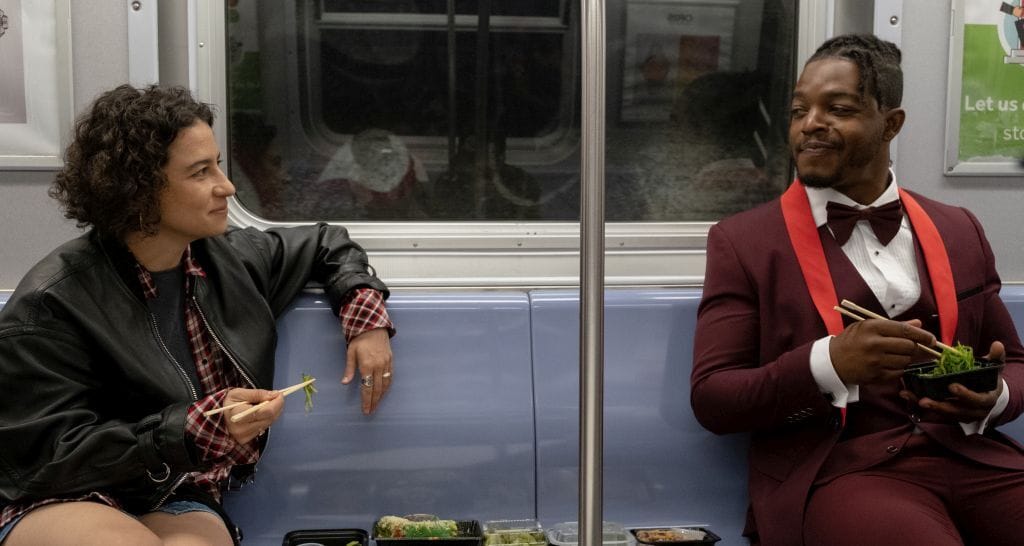 So, anyway, loaded down with a ton of expensive sushi, Eden takes the subway home, and along the way she meets a man named Claude, who is fresh off his first minor role in a movie. The two have an intense meet-cute, during which, they eat the sushi together while riding on the New York subway, which is maybe the only place in the world where it might be more gross than a hospital to eat sushi.