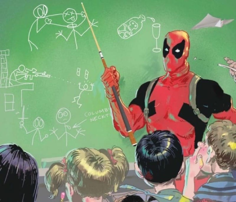 But back on Deadpool’s world, before they can stop Mr. Paradox and his Time Ripper, Wade and Logan find themselves facing the assembled assholes of the Deadpool Corps, a collection of murderous Deadpool variants from across the multiverse, like… Ladypool, a lady version of Deadpool, or Kidpool, a kid version of Deadpool, or Babypool, a baby version of Deadpool, or Headpool, a floating zombie head version of Deadpool, or Cowboypool, a… well, you probably get the pattern by now. There’s also Canadapool, Dancepool, Welshpool, Deadpool 2099, Roninpool, Knightpool, Zenpool, Golden Age Deadpool. So many Deadpools for Deadpool and Wolverine to kill in a big climatic battle.
