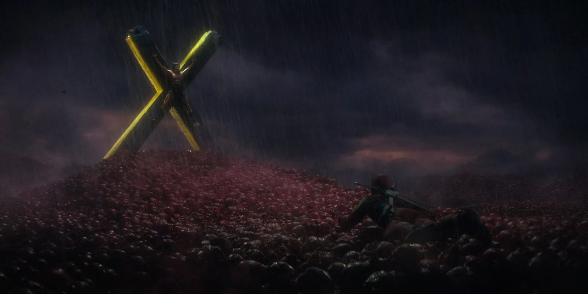 This scene was also one of the reasons why those dipshit Evangelical Christians were so angry at this film, because obviously, only Jesus has ever been crucified, and also being crucified on a big X over a field of bloody skulls is exactly like what happened in the Bible, so this was obviously meant to mock Jesus, right? Can’t get nothing past these guys! And people say these cultists are fucking stupid!