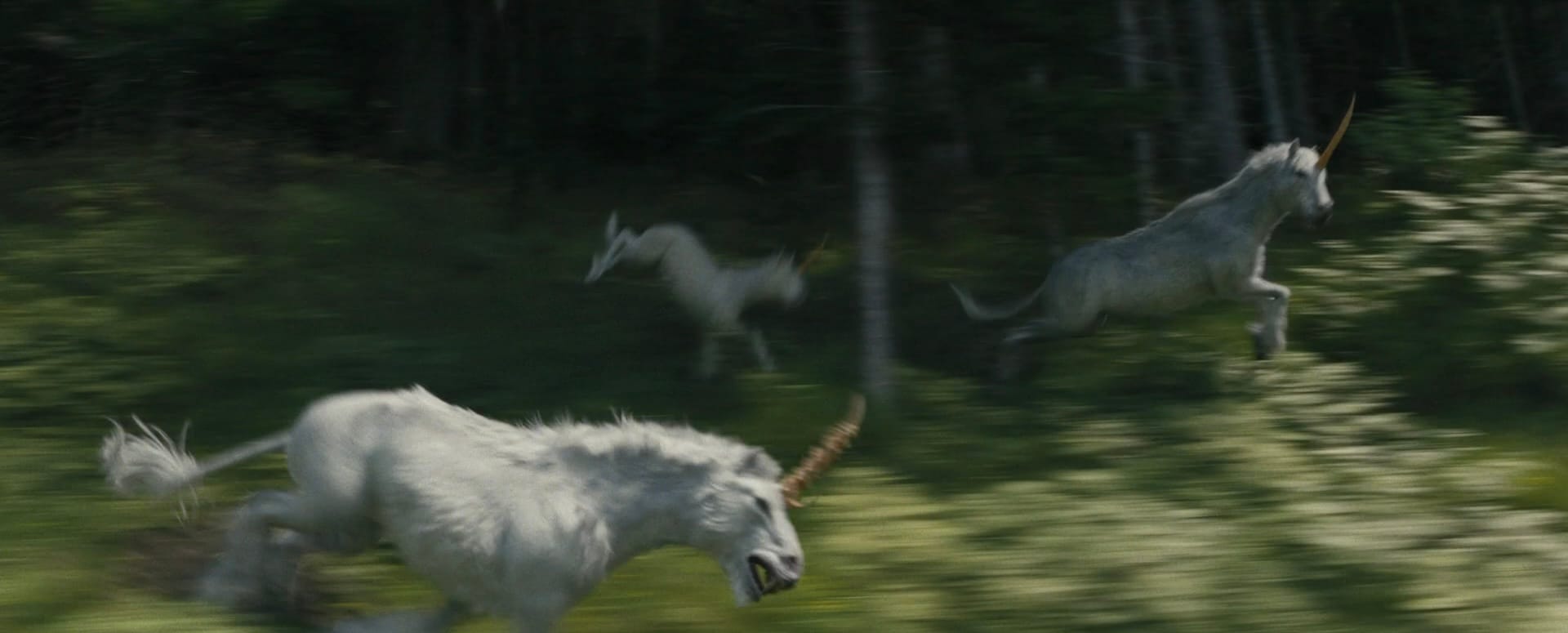 Unfortunately for them, as the unicorn corpse is being wheeled out to the van, a pair of much larger and much angrier unicorns show up and start killing people, before gunfire chases them off into the woods.