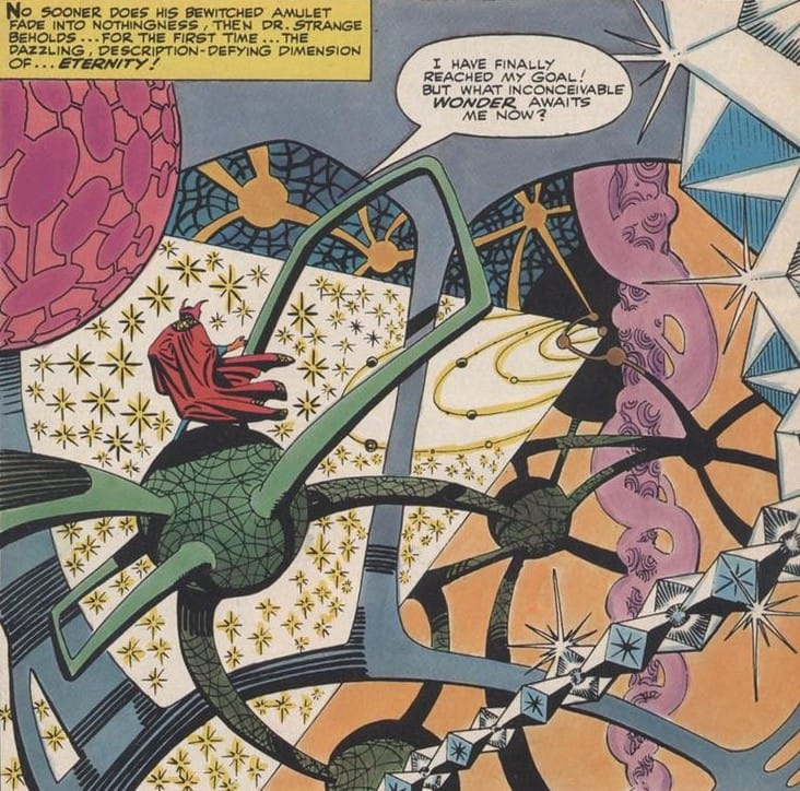 But speaking of typical, or more atypical, I guess, an interesting aspect of Dr. Strange is that he‘s a character who may have originally been meant to be Asian. It's possible. Probable, even. Granted, printing standards of the time make it a little unclear if this was wholly the intention of the artist, or if it‘s just the result of ink bleed, but it's accepted lore that Ditko intended Strange to be Asian, as a sort of response to that aforementioned pulp era tradition of a white guy traveling to the Far East, but it was then very quickly decided by others, probably Stan Lee, that... Nah, and they made him into yet another white guy. But hey, at least they didn't make him blonde and blue-eyed this time.