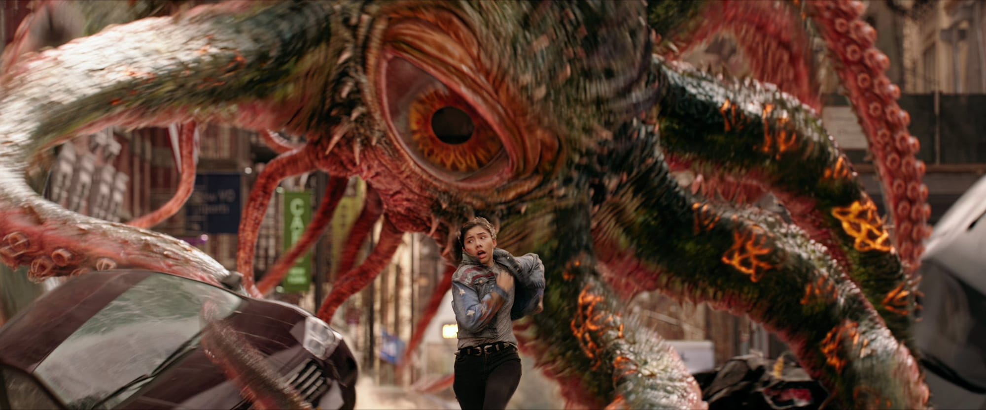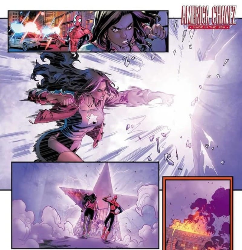 Anyway, the wedding is interrupted by a fight on the street between a teenage girl in a jean jacket and giant cyclops/octopus demon, because New York is crazy, y'all. After Strange and Wong dispatch the monster, he realizes that the girl is America Chavez, the same girl from his dream, and the explanation of who she is and how she is being hunted because of her ability to travel the multiverse, leads to one of my favorite jokes about Spider-man.