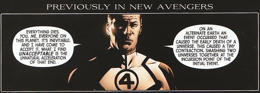 The Illuminati's meddling not only leads to the secret invasion of the Skrulls, but the Dark Reign of Norman Osborn, and eventually... the collapse and destruction of the entire Multiverse.