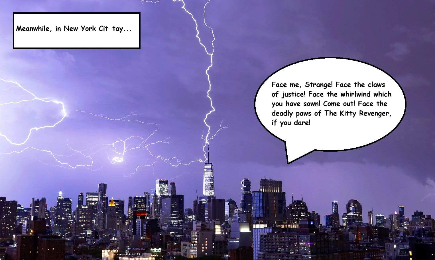 Although, if we're being honest here, if Dr. Strange saved the universe but killed my cats while doing it, well... there's no apology that is going to bridge that gap between us. Eventually, I will be showing up outside the Sanctum, dressed in a funny outfit, one that reflects a mixed theme of whatever powers I have managed to scrounge up, as well as my need for revenge in the name of my cats, and I will loudly demand he face me...