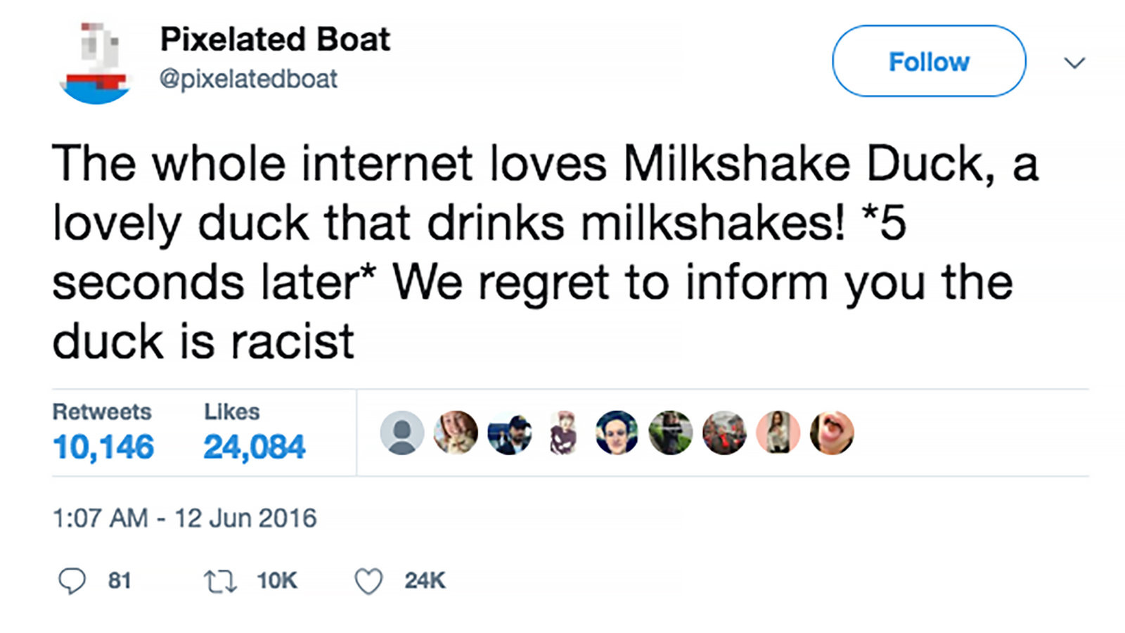 A Milkshake Duck is a meme, based off the above tweet, and it’s what you call a person who gains sudden notoriety on social media for something cute and positive, or charming, or endearing, or funny, and it spreads like a wildfire, suddenly they’re everywhere, and the internet loves them… But soon enough, they’re revealed to be a huge jerk, usually due to some sort of distasteful history, or offensive behavior they regularly engage in. Y’know… like they’re a Nazi, or a bigot, or an Anti-vaxxer, or a January 6th Insurrectionist, a sexual assaulter, or who knows, maybe a Flat Earther. Basically, pick any one of the myriad things that Trump, the GOP leadership, their Talking Head Pundits, and their voting base are regularly guilty of.