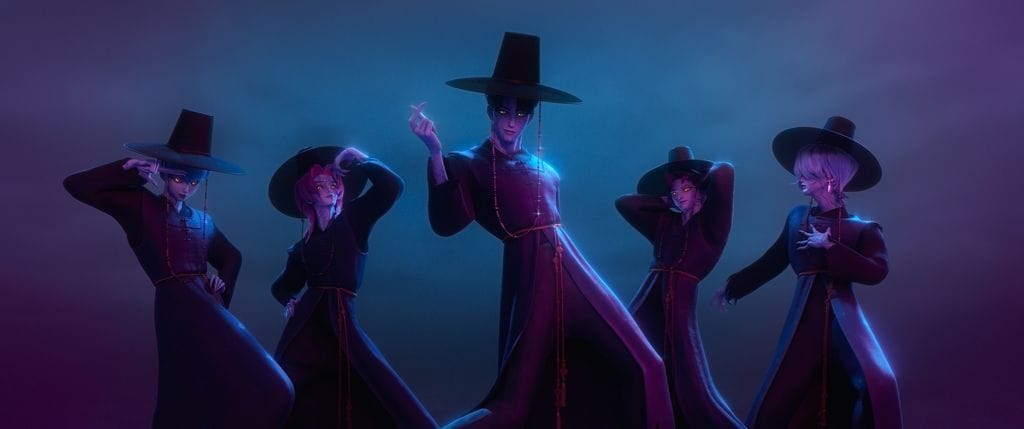 A big part of the inspiration for the entire idea apparently comes from Korean shamanism. In Korea, shamans, known as mudang, act as intermediaries between the human and the spirit realms, and conduct rituals, known as gut, for healings, fortune-telling, to resolve conflicts, or to drive away evil spirits, and they will often using music, dance, and costumes in their incantations. Tying that to K-Pop totally makes sense, especially if you’ve seen the movie Exhuma.