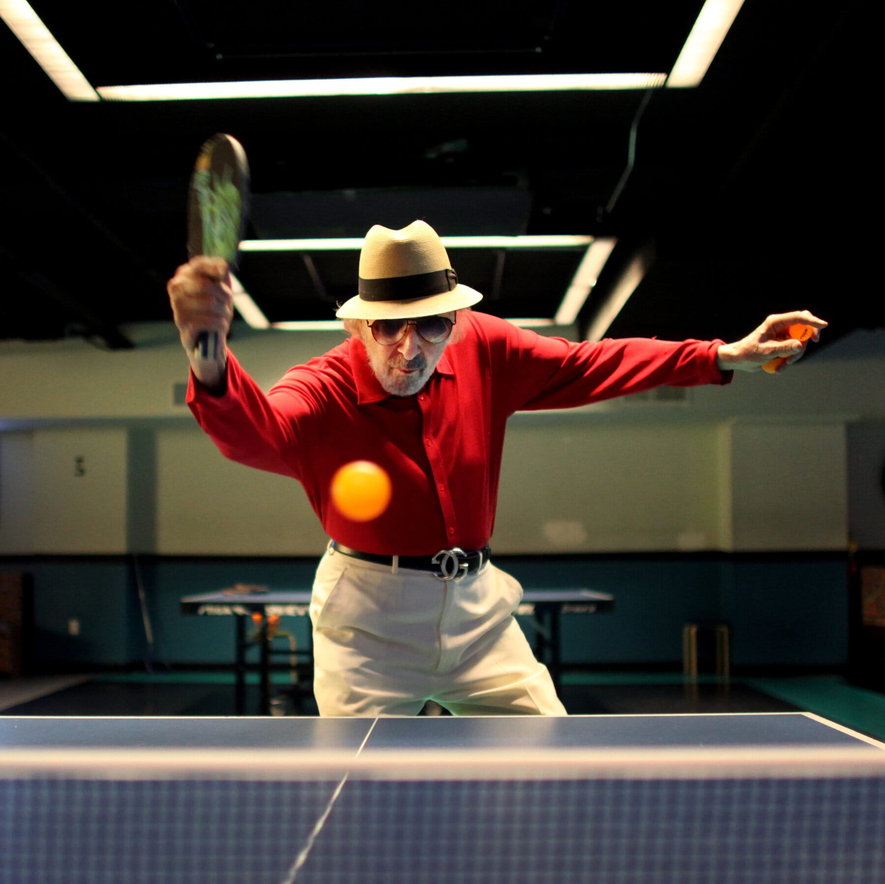 The film Marty Supreme is apparently very loosely based on real life American table tennis player, author, and ping pong bad boy Marty Reisman. A flamboyant figure known for wearing bright clothing and a signature Panama hat, basically the Dennis Rodman of Ping-Pong, Reisman started playing table tennis after a nervous breakdown at the age of nine, because he found the sport soothing. Known as “the Needle” due to his slender build, he was an inveterate hustler and a showman, who toured as a ping-pong novelty act with the Harlem Globetrotters, and was active in NYC’s table tennis community for years. He won multiple championships, and was a long-time advocate of the traditional hardbat style of table tennis.