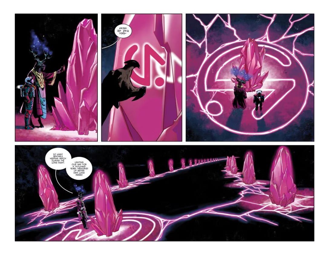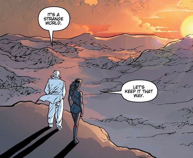 As I just said, I love Jonathan Hickman’s stuff, and 3W3M—meaning Three Worlds, Three Moons—is his substack. It is a brand-new world of comics stories being created from the ground up, by a wide range of talent, and watching this process as it happens is part the experience of subscribing to the Substack.