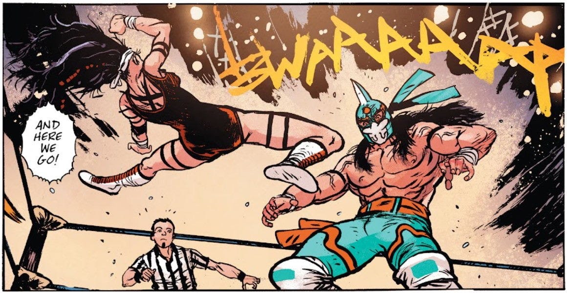 But… people just kept talking about it, and eventually I was worn down. There was just too much buzz. Written and drawn by Daniel Warren Johnson, who apparently wasn’t a wrestling fan either, at least not until the pandemic—which is something I understand, because the Our Town-esque era of pandemic pro wrestling, which took place in a practically empty and nearly silent stadium with only the wrestlers present, was maybe the greatest piece of 21st Century Pop Art that I’ve ever fucking seen—showed me that not only was the buzz about this book right, but undeniably…