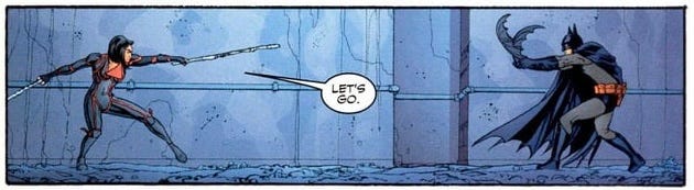 In this new version, Luke Fox used to be known as Batwing, a kind of armored Batman with metal wings, and Kate Kane is Batwoman, a Gotham DA who took to the rooftops when justice in the courtroom failed. They’re two members of the large and sprawling Bat-family that I’m not all that familiar with, mostly because I don’t read regular continuity Bat-titles. The idea is that Luke is a disillusioned hero who has decided to put his fortune to better use than beating up murder clowns in dark alleys. Does that mean funding exisiting Non-profit outreach programs? Building Social Safety Net Infrastructure? Direct Action support?