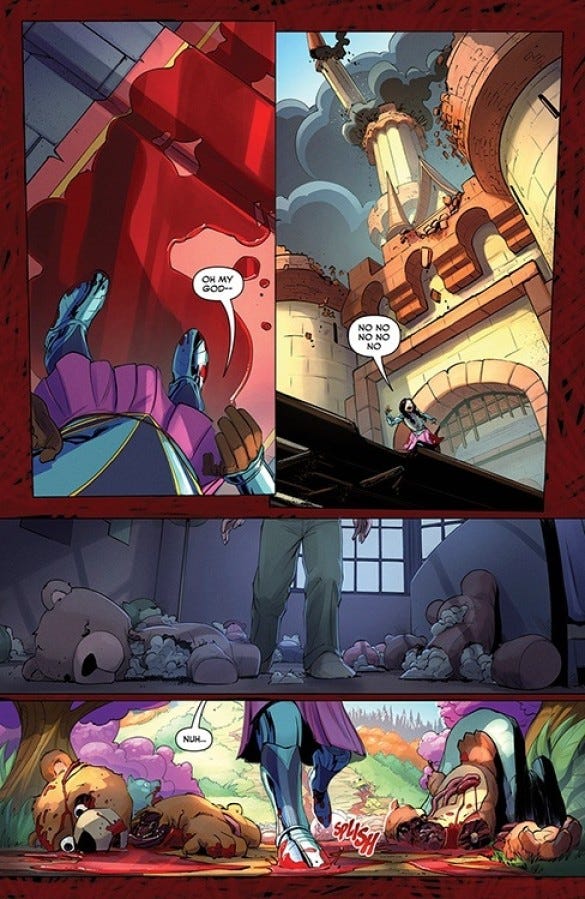 This is a new book, there’s only been three issues published so far, so I’m not entirely sure where it’s heading, or if it will pull it off, but I’m loving what I’ve seen so far. Part horror story, part Narnia fantasy, Rose is somehow connected to some witch hunts from centuries ago, where the witches possessed real magic, and I assume that same magic is now manifesting itself in her through her creation of a fantasy realm filled with cute fantasy animal-people that she rules. But then, like I said, something very bad and very bloody happens, in both the fantasy world and the real world.