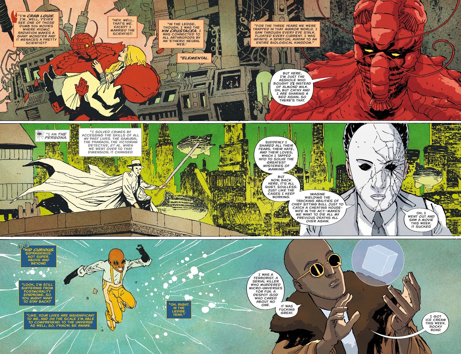 Five years later, they have all returned to the world they originally came from, but they’re now more of a support group than they are a superhero team, as they struggle to fit back into their old lives within a flatter, more 2-D superhero world. They’re like junkies jonesing for their lost lives of depth and insight.