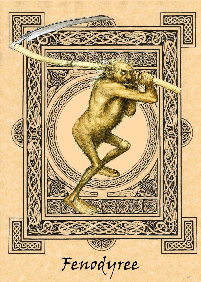 In Manx folklore, the Fenodyree is a kind of fairy that is covered in hair, or a “hairy fairy” (not to be confused with a Bear), who mostly prefers to work naked (although the mistake is understandable). Much like creatures known as Brownies, it’s known to be helpful to humans, often doing tasks like… carrying big rocks, or cutting meadow grass really quickly.