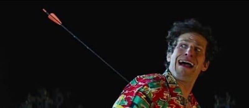 But then… as the two outcasts bond over drinks and depression and gallows humor, finding a connection in their shared despondency, their drunken make-out session out amongst the desert rocks is suddenly interrupted when Nyles is shot in the shoulder by an arrow.