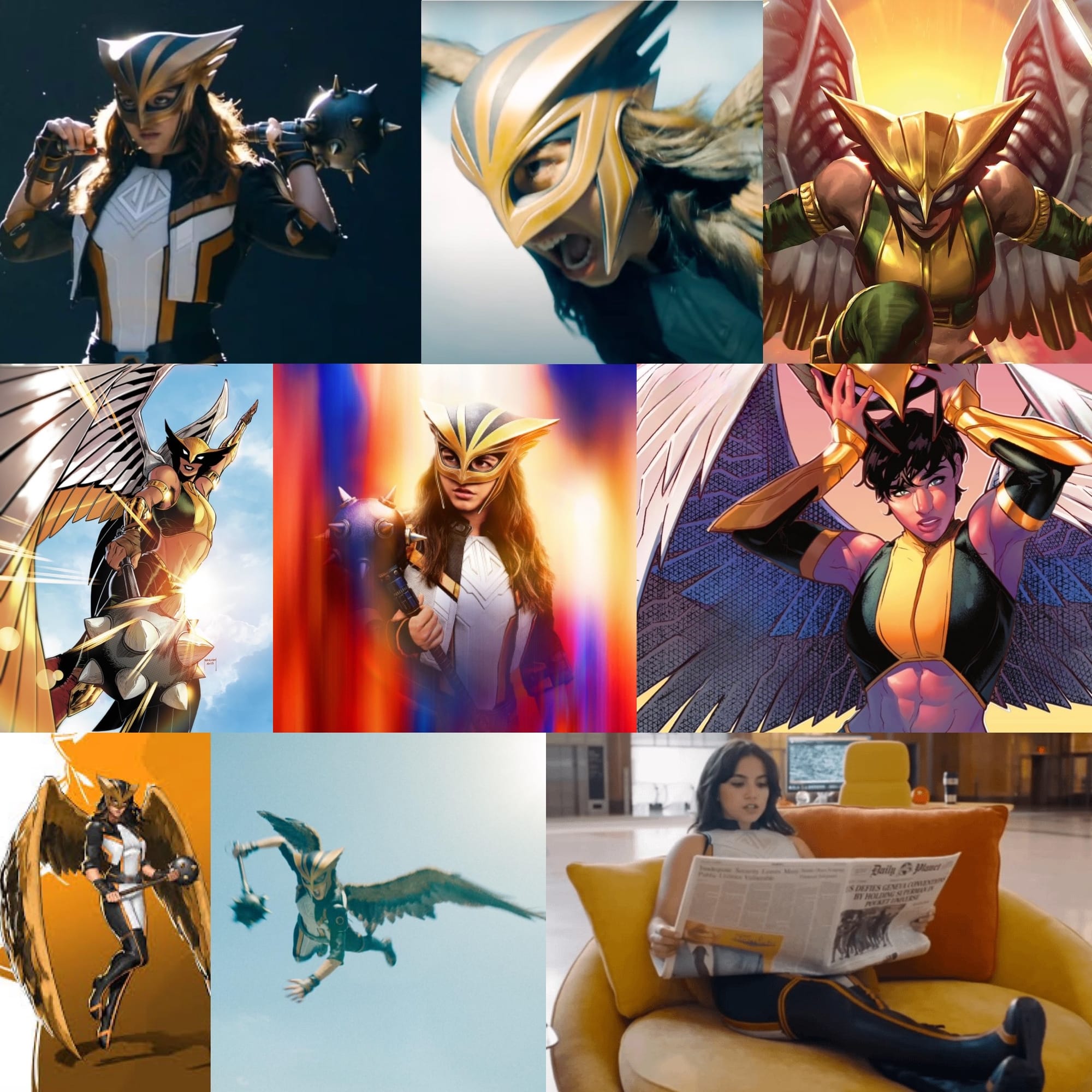Much like Hawkman, each Hawkgirl has a muddled and confused history of sometimes being a winged warrior alien from the planet Thanagar, and sometimes being the reincarnated female half of two lovers from ancient Egypt who have lived and died and been reborn over and over in constant cycle of love, war, and death, and sometimes being a little from column A and a little from Column B. All these versions have been separate characters, then merged into one, and then separated again over the years. In short, like Hawkman, Hawkgirl is a narrative mess.