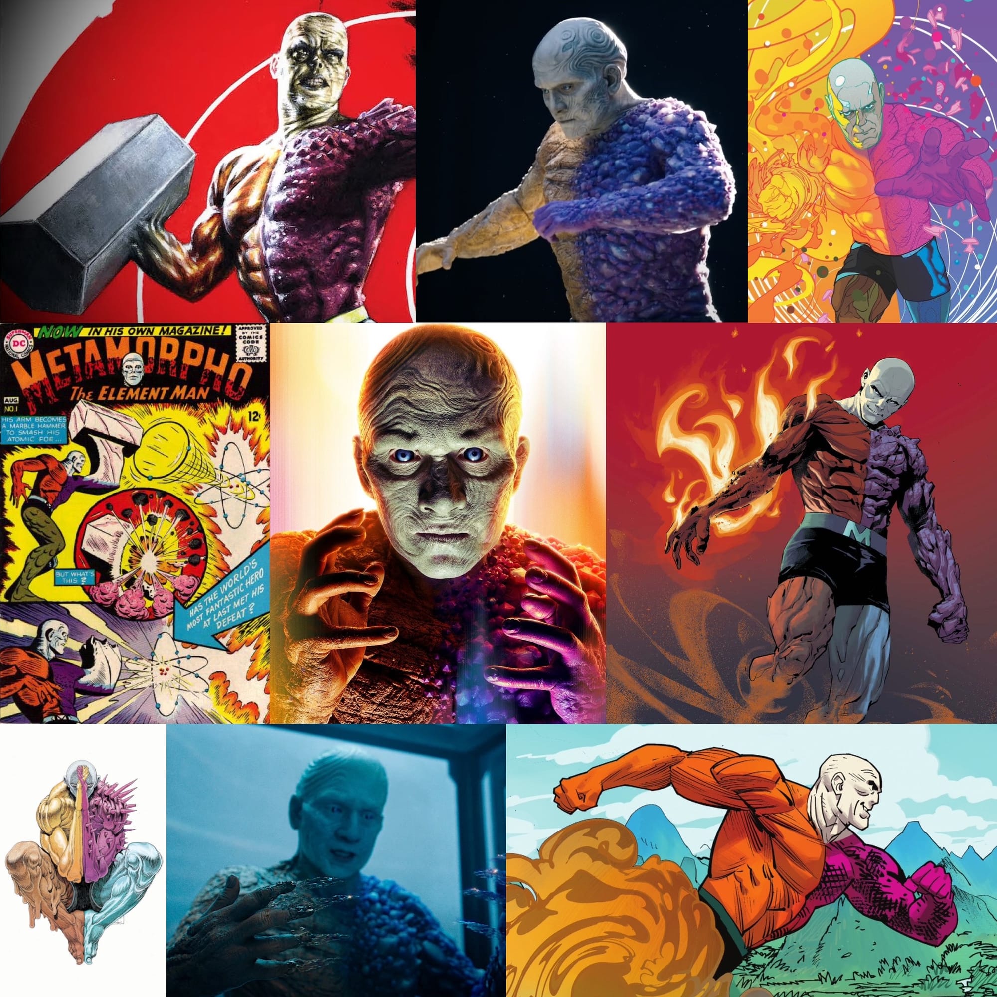 But this did not kill Rex Mason, no... It transformed him! Into Metamorpho, the Element Man! Rex was now a metahuman made up of several different elemental substances, and was now able to chang his shape and chemical composition at will, but unfortunately, he was also cursed with four differently colored and textured limbs and also a weirdly white face.