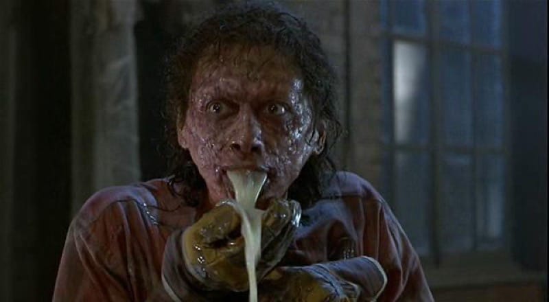 Anyway, The Fly is one of David Cronenberg's most well-known films, a pop culture icon that deservedly won the 1987 Oscar for best make-up. 1987 was, of coures, a ridiculously long time ago. It was so long ago that the characters in this film all tuck their shirts into extremely high-waisted slacks, and then walk around like it doesn't look insane that their waistlines are practically in their armpits. Also, in this movie, everyone casually smokes in their homes, all the time, and they all have huge and obviously oft-used ceramic ashtrays on display as a regular part of the decor, like: "Look at my huge ceramic ashtray here on my kitchen table! It’s a centerpiece! People from any place around my table can use it simultaneously, but despite its massive size, despite the way it takes up a huge swath of real estate here on my table, it’s mostly for me! Currently, it’s filled with smashed butts and ash! How lovely! Would you like some quiche?"