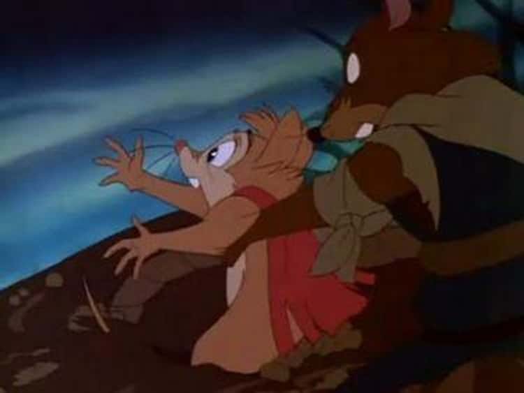Because of Jonathan Brisby’s actions, the rats agree to move the Brisby house out of the way of the plow. All of this leads to a whole bunch of new peril, and a climax that is a series of betrayals, culminating in a big sword fight under the flashing racket of a thunderstorm, all as the Brisby house, with the children trapped inside, has begun to sink into the mud, but only after friendly grandpa rat is crushed to death beneath a cinder block. In the end, the rat villain is impaled at the end of a rival rat’s sword.