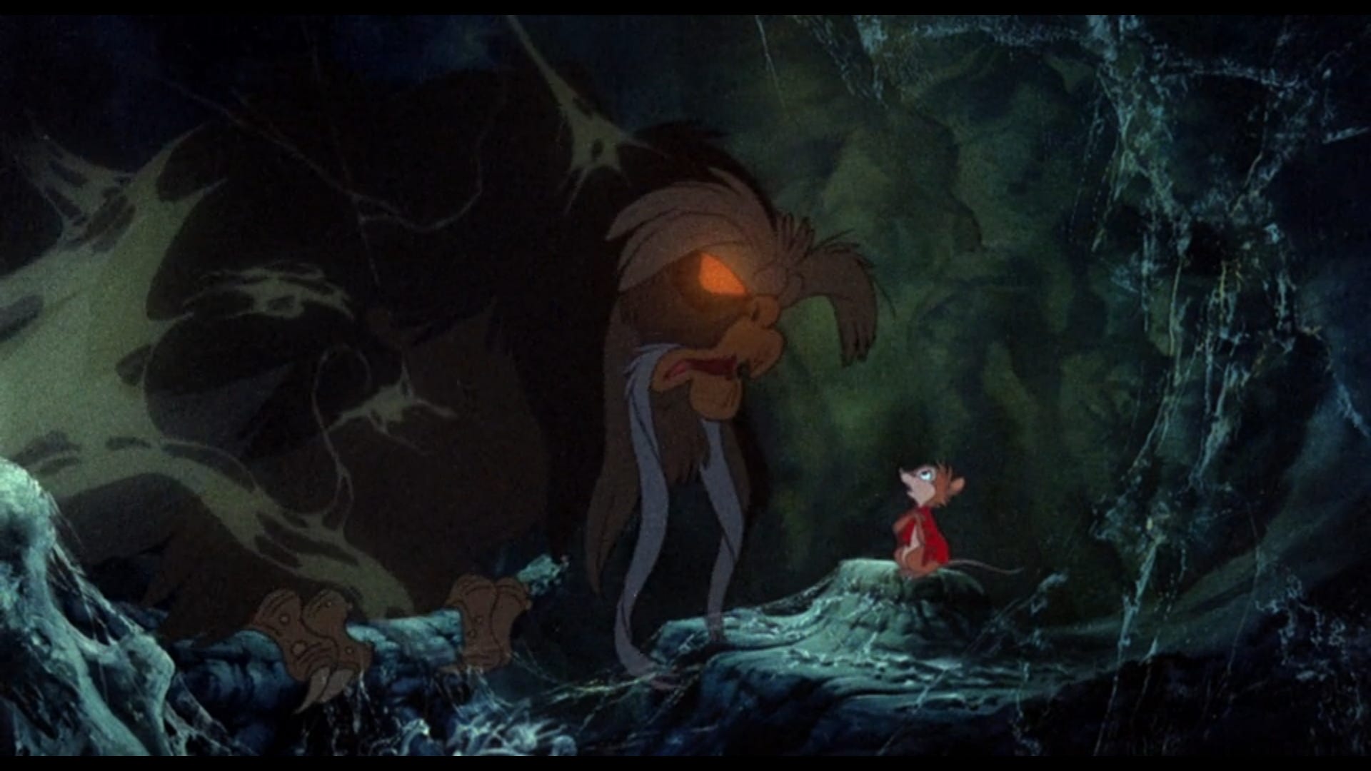 There’s Dragon, the one-eyed, ill-groomed monstrosity that is the farmer’s cat, a terrible beast who lives only to murder, the remorseless creature who ate Jonathan Brisby alive, and who now moves through the fields like a hungry shark. There’s the massive pile of shifting and clattering mouse bones that Mrs. Brisby stumbles through while seeking the wisdom of the Great Owl. There’s the nightmarish spider that stalks her through the eerie darkness of the Great Owl’s hallow, only to be noisily squashed beneath the Great Owl’s gnarled talons. Then there’s the Great Owl himself, a huge and terrible god looming over Mrs. Brisby with its balefully glowing eyes, clad in a shroud of cobwebs… I imagine this film must have scared the shit out of an entire generation of children.