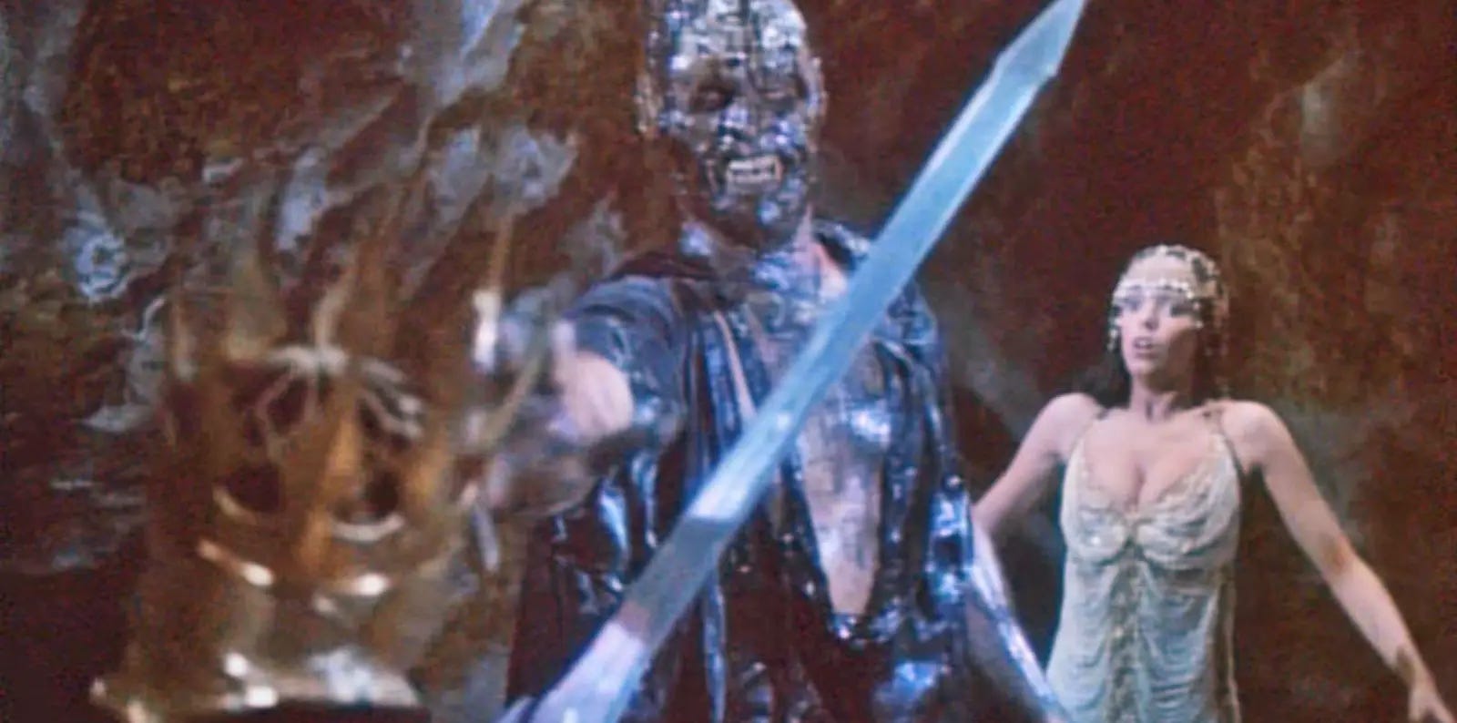 I wouldn’t recommend this film to anyone except for those of us who are here specifically to appreciate its gaudy schlock and campy performances. Does it look good? Sometimes, actually, yeah it does. There’s a red-shaded slow motion fight that’s kind of amazing. And what about the schlock, you ask, is that awesome too? Yeah, at times there’s a couple of pretty cool things, like the previously mentioned faces on the side of the sorcerer’s tomb. Plus, some of the inexplicably glamrocky outfits are pretty great too, but… it’s all too few and too far between.
