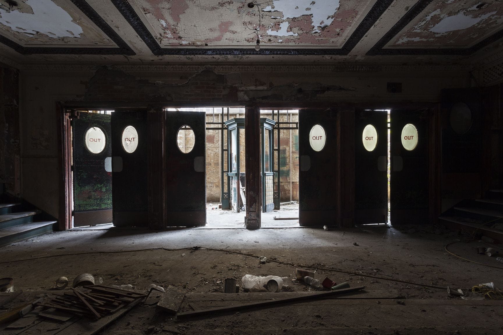 A cold wind blows through the empty ruins of an abandoned auditorium.