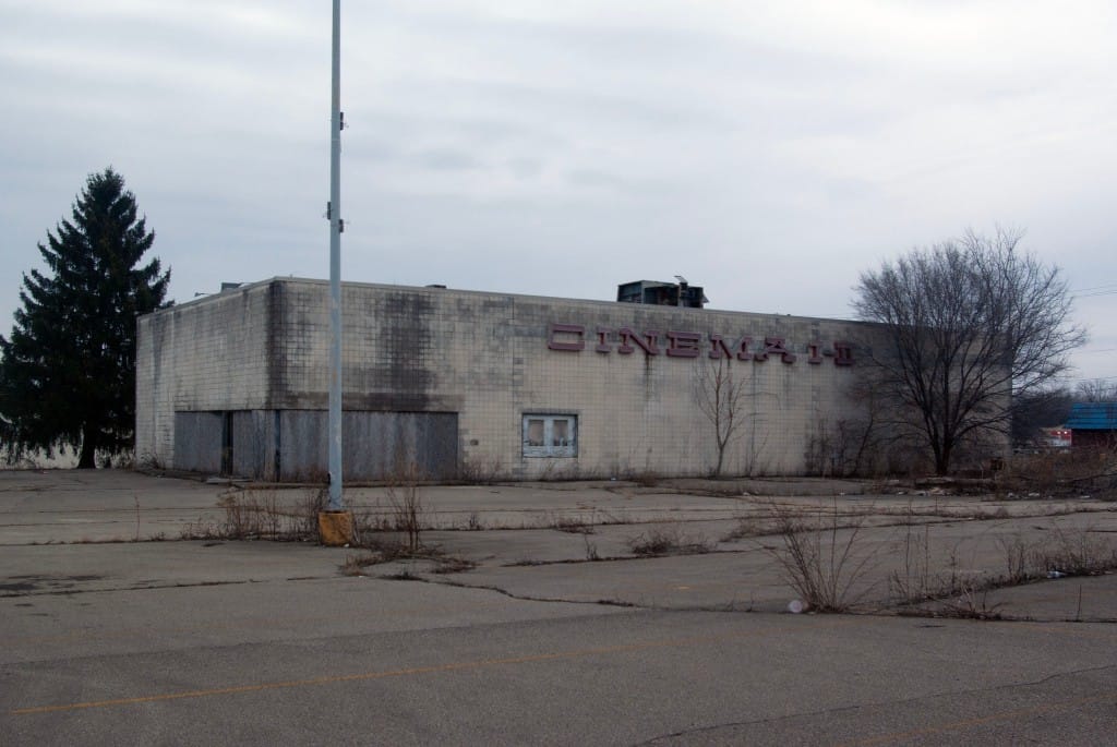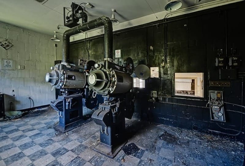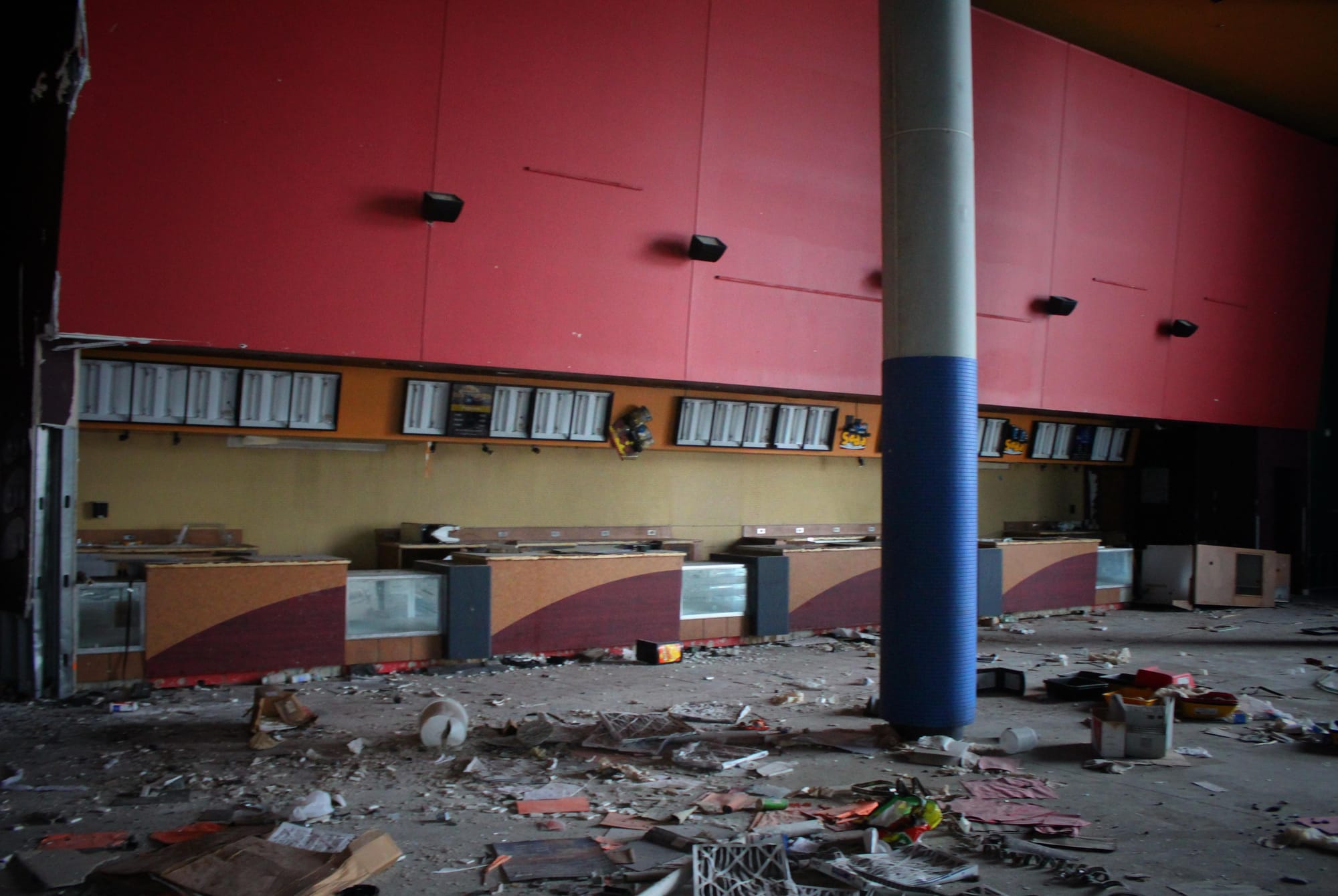 (We see an auditorium, a once clean and neatly-ordered movie theatre, the kind you could find in any mall multiplex, but now it’s in ruins. The rows of seats are still bright red, as they’re rarely touched by the sunlight, but the concrete floor is filthy, streaked with mud and garbage, like it had once been flooded, but has now dried. The ceiling is broken and sagging, with several tiles moldering visibly, while others are missing. There’s a hole in the center of the roof, and a single sharp beam of sunlight pierces the gloom, casting back the shadows. At the back of the theatre, the exit door is open onto a black hole.)