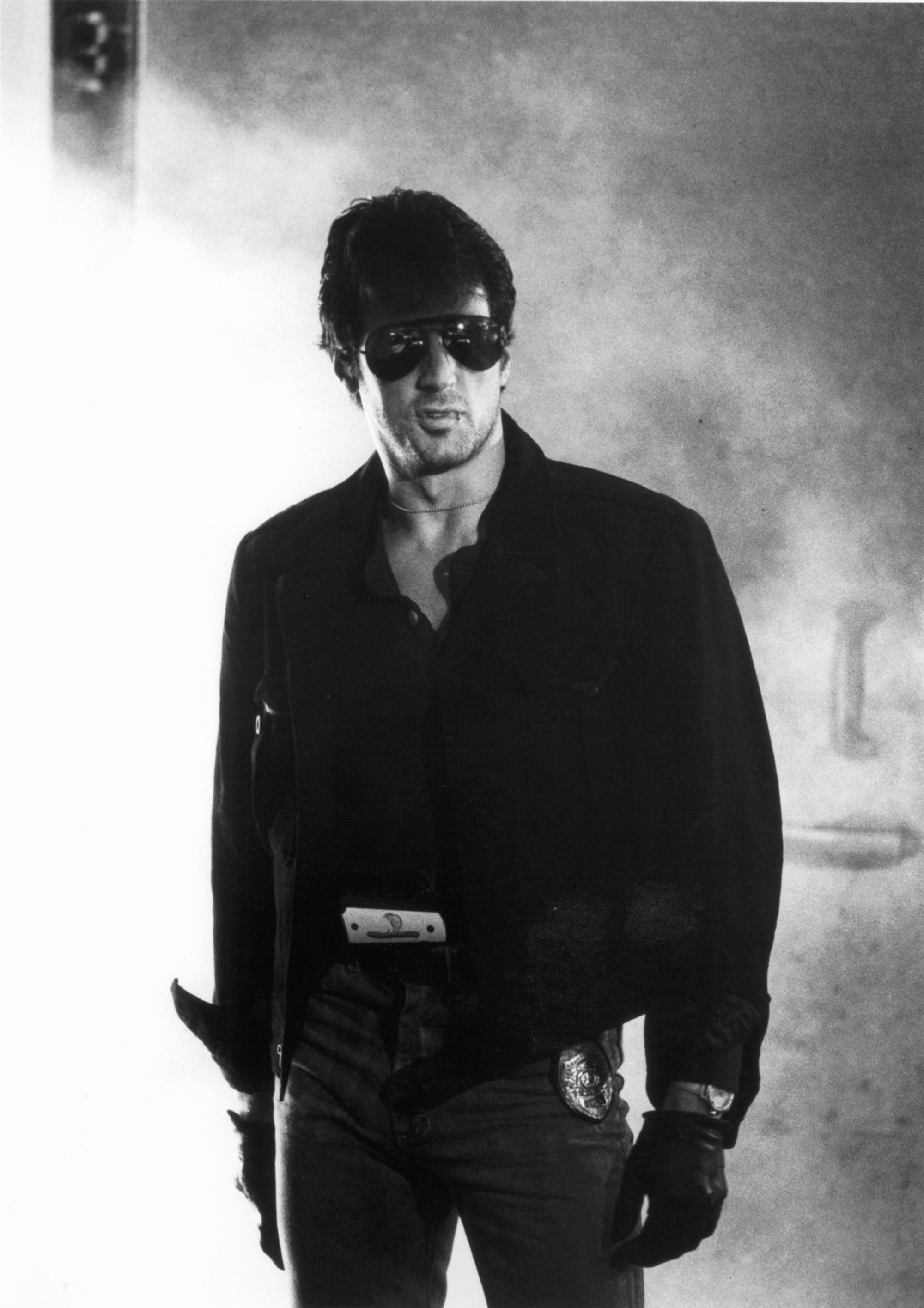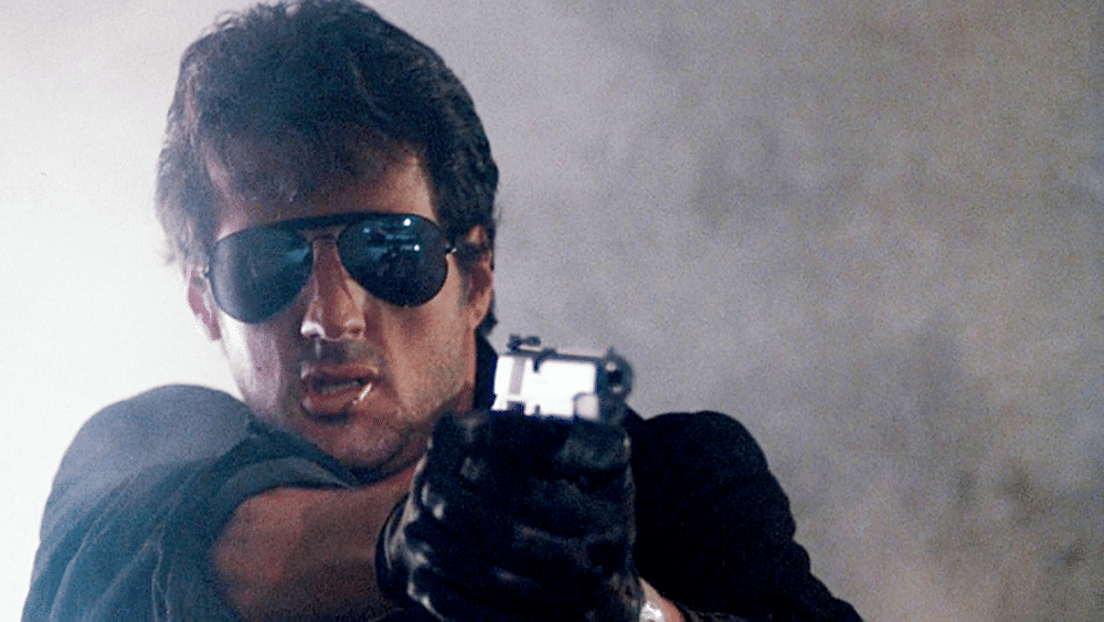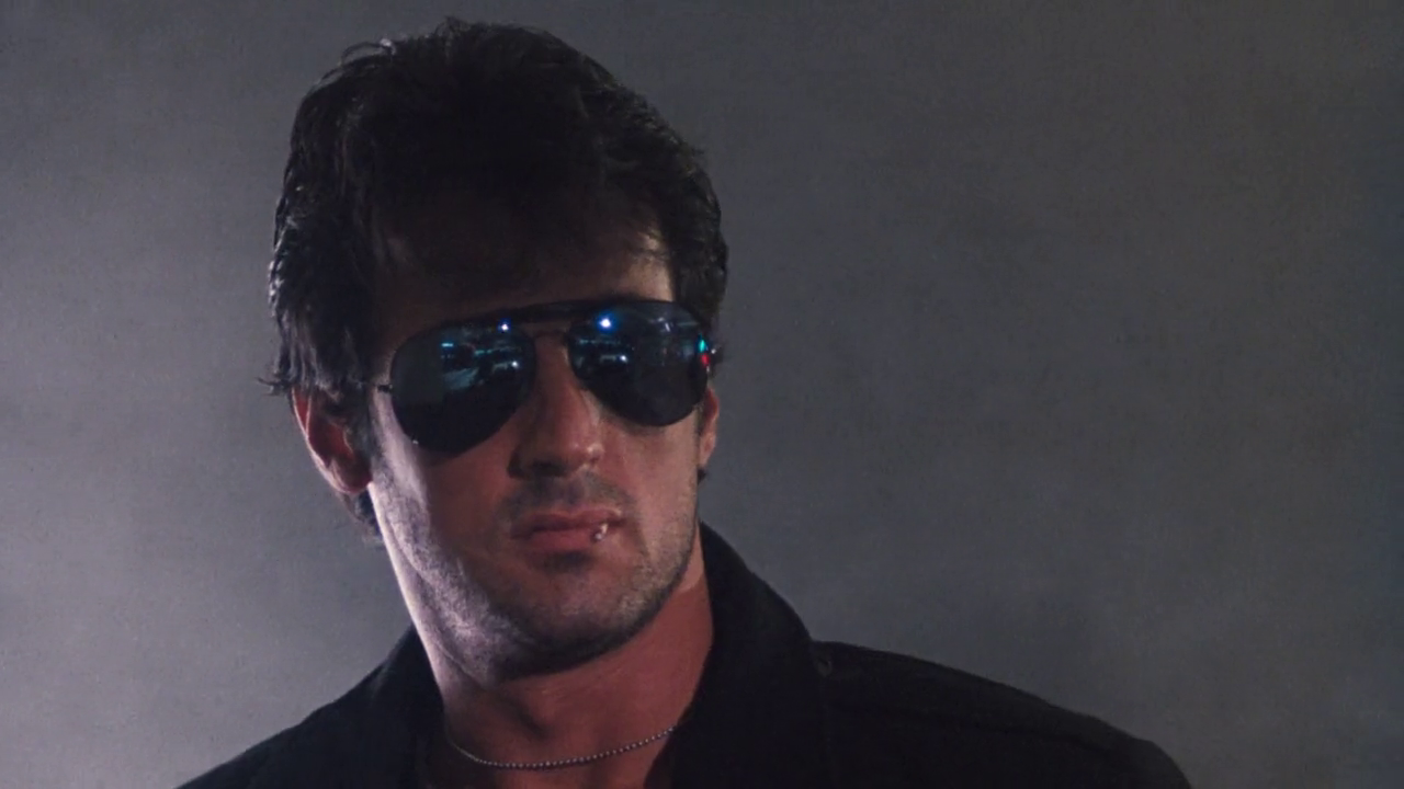 The film opens with a weird guy (not Stallone) walking into a Los Angeles area grocery store. Inside, he pulls out a shotgun and starts shooting the cantaloupes, watermelons, and coffee beans, all in slow motion, while the customers panic.
