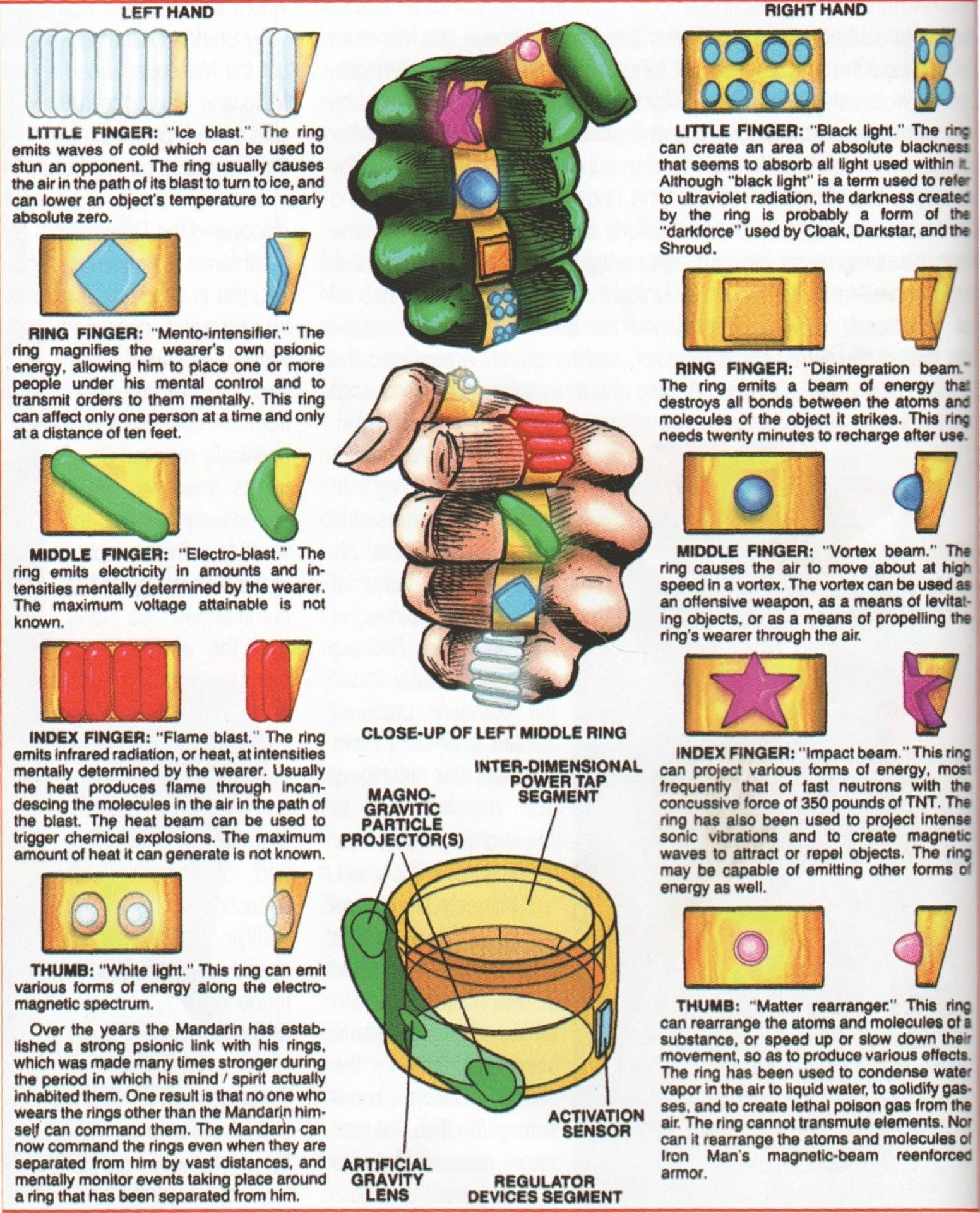 From the start, every comic-head recognized that the Ten Rings was a reference to The Mandarin, and as the MCU went on, and the Ten Rings stuck around, it was clear that at some point, the Mandarin would show up too, because the Mandarin wears ten rings. Besides being super gaudy and ostentatious, each ring has a specific power, as detailed below in this super awesome panel from issue #15 of the Official Handbook of the Marvel Universe: Book of Weapons, Hardware, and Paraphernalia from 1983, that I wish I had framed and hanging on my wall...